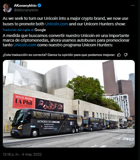 Incluso, como parte de su campaña promocional de sus tokens, la empresa hizo publicidad en el exterior de buses, como compartió el CEO de Unicoin hace tres años mediante una foto publicada en X, que se puede ver a continuación.
