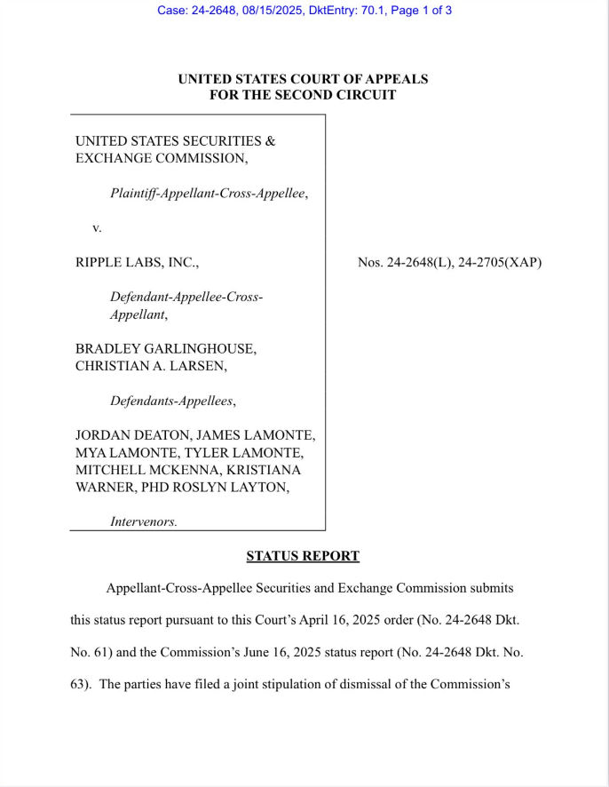 El largo y publicitado caso de la Comisión de Bolsa y Valores (SEC) de Estados Unidos contra Ripple Labs parece acercarse a su final. Sin embargo, un nuevo documento presentado por la SEC el 15 de agosto ante la Corte de Apelaciones del Segundo Circuito de Estados Unidos sirve como un recordatorio crucial: a pesar del acuerdo de las partes, el veredicto final aún pende de la decisión de la corte.