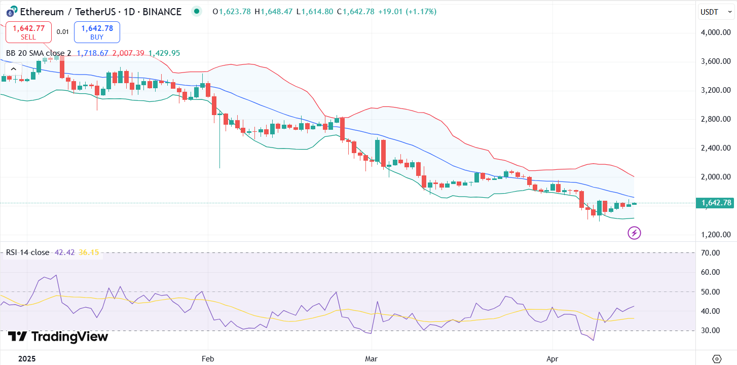 Actualmente, Ethereum se encuentra cerca de la media móvil de 20 días, correspondiente a la banda media de Bollinger en $1.655. Si logra mantenerse por encima de este nivel durante varios días, los analistas técnicos podrían esperar un impulso hacia la banda superior en $2.000.