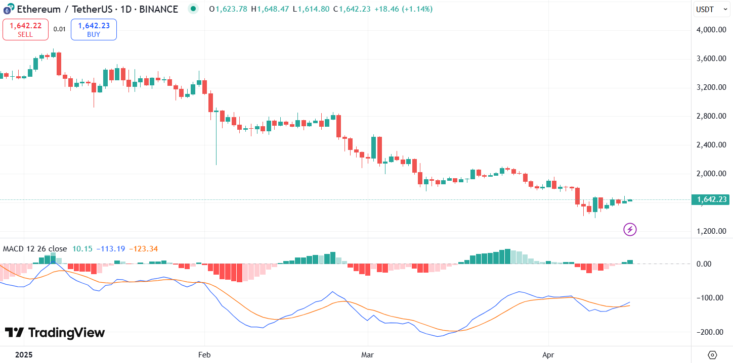 El indicador MACD continúa por debajo de la línea de señal, aunque el histograma muestra un leve movimiento positivo. Esto sugiere que el impulso alcista es débil por ahora, pero no está completamente descartado. Si el MACD cruza de forma bajista, podríamos ver un movimiento hacia los $1.400 o incluso más abajo.
