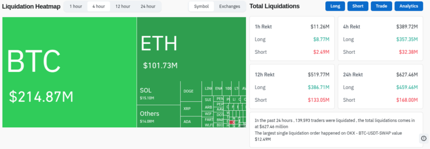 El movimiento de la ballena también desencadenó una cascada de liquidaciones en el mercado de futuros. Según datos de Coinglass, en las últimas 4 horas se han liquidado más de 389 millones de dólares.
