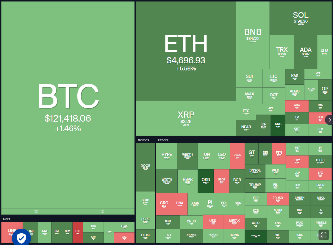 Los compradores han vuelto a empujar a BTC hacia su máximo histórico de USD 123.218, lo que indica una sólida compra en cada pequeña caída.