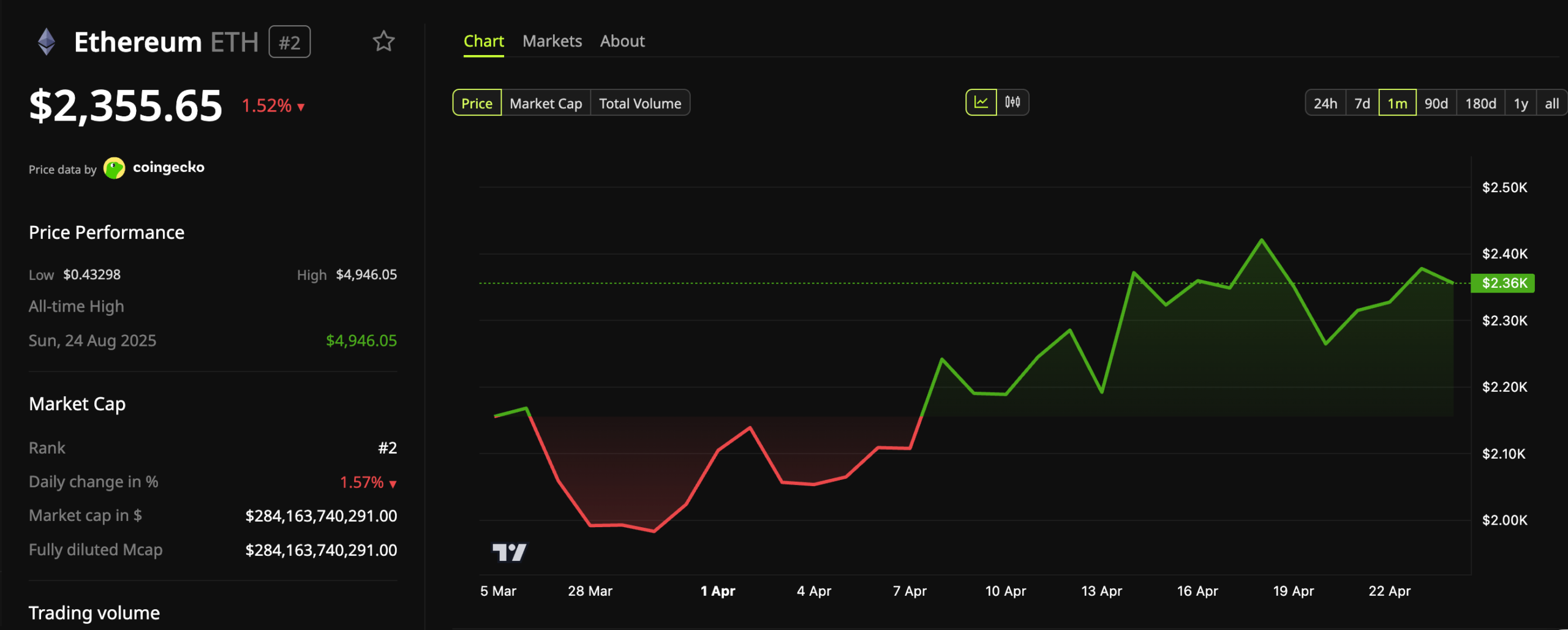 Ethereum subió brevemente por encima de 2,400 dólares ayer, pero después perdió esas ganancias. Al momento de escribir, cotizaba en 2.355 dólares, cayendo 1.52% en el día.