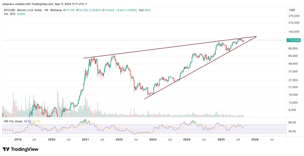 The long-term BTC price rally suggests the token is reaching the edge of the persisting consolidation within a rising wedge. The weekly RSI trades above the average and has just displayed a bullish divergence, hinting towards a bullish continuation. Moreover, the crypto has rebounded before testing the support, substantiating the bullish claim. Therefore, the Bitcoin price seems to be primed to reach $125K, provided it surpasses and sustains above $118,000, this month.