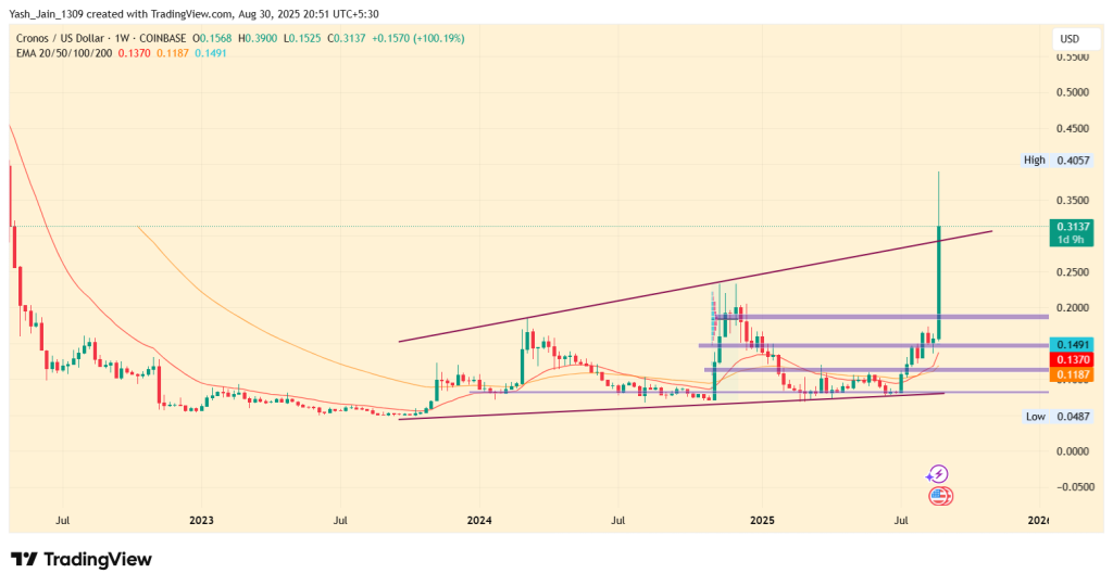 This pattern suggests that the CRO price could push past key resistance zones, by paving the way in higher high structure. If this happens then potential targets are present near $0.50 to $0.60 in the upcoming weeks.