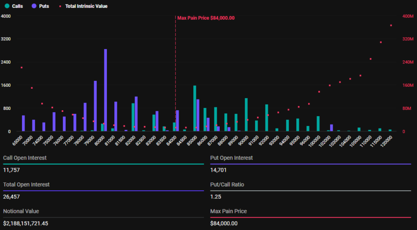 Según datos de Deribit, 26,457 opciones de Bitcoin expirarán hoy, significativamente menos que el cierre del primer trimestre (Q1), donde 139,260 contratos de BTC se liquidaron la semana pasada. Los contratos de opciones que vencen hoy tienen una relación Put/Call de 1.25 y un punto de máximo dolor de 84,000 dólares.