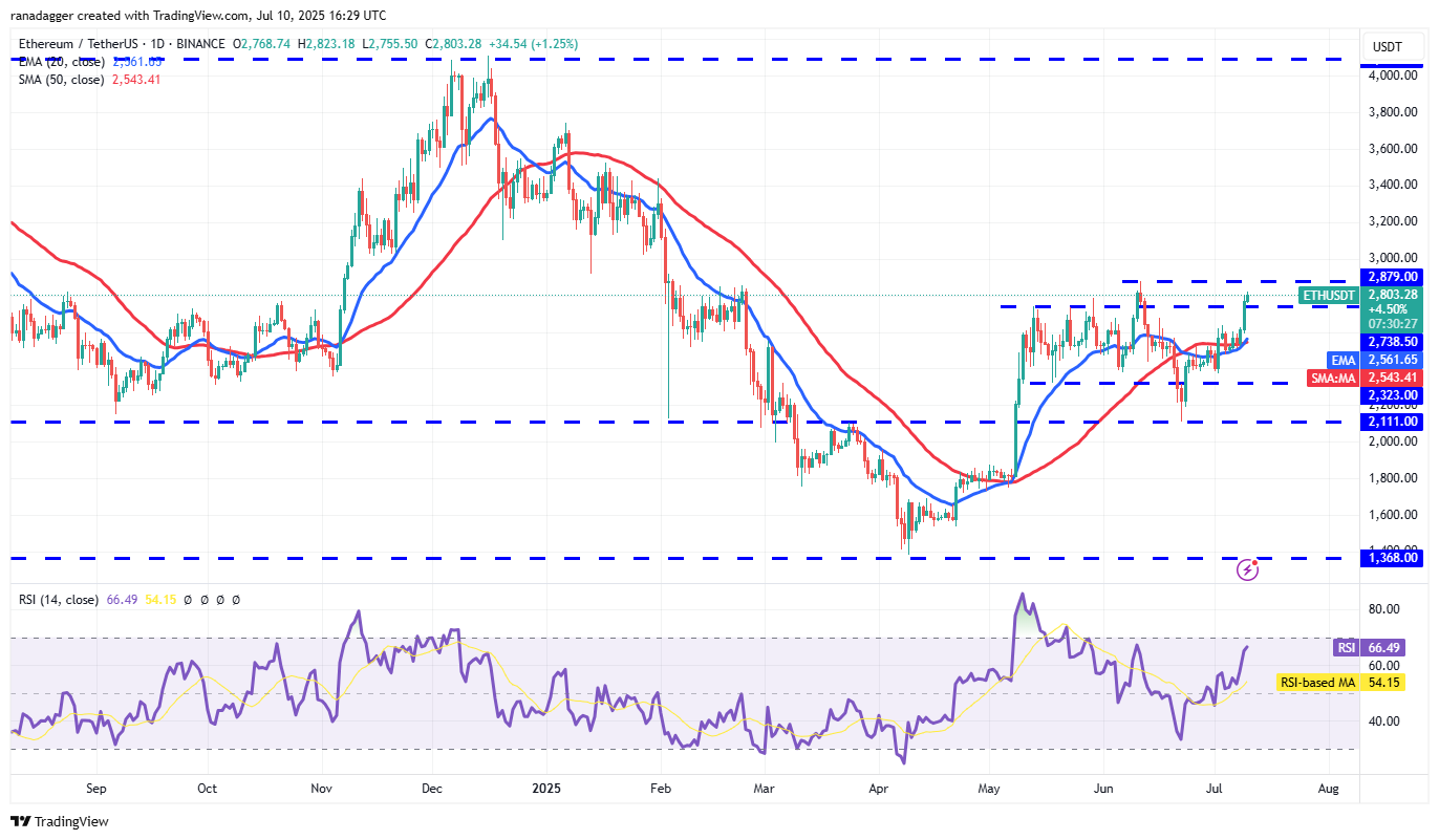 Es probable que los vendedores tengan otros planes. Intentarán hacer retroceder el precio por debajo de 2.738 dólares. Si lo hacen, el par podría caer hasta la EMA de 20 días, que es un nivel crucial a tener en cuenta. Si el precio rebota en la EMA de 20 días, los alcistas intentarán de nuevo impulsar el precio por encima de 2.879 dólares.