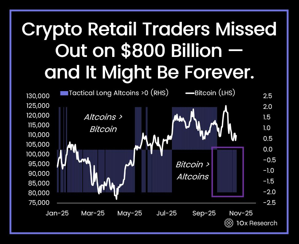 “Las altcoins han tenido un rendimiento inferior a Bitcoin en aproximadamente 800.000 millones de dólares este ciclo, un déficit que habría beneficiado en gran medida a los inversores minoristas”, dijo 10x, añadiendo que esto está llevando a los minoristas a buscar “vías alternativas para obtener retornos rápidos”.
