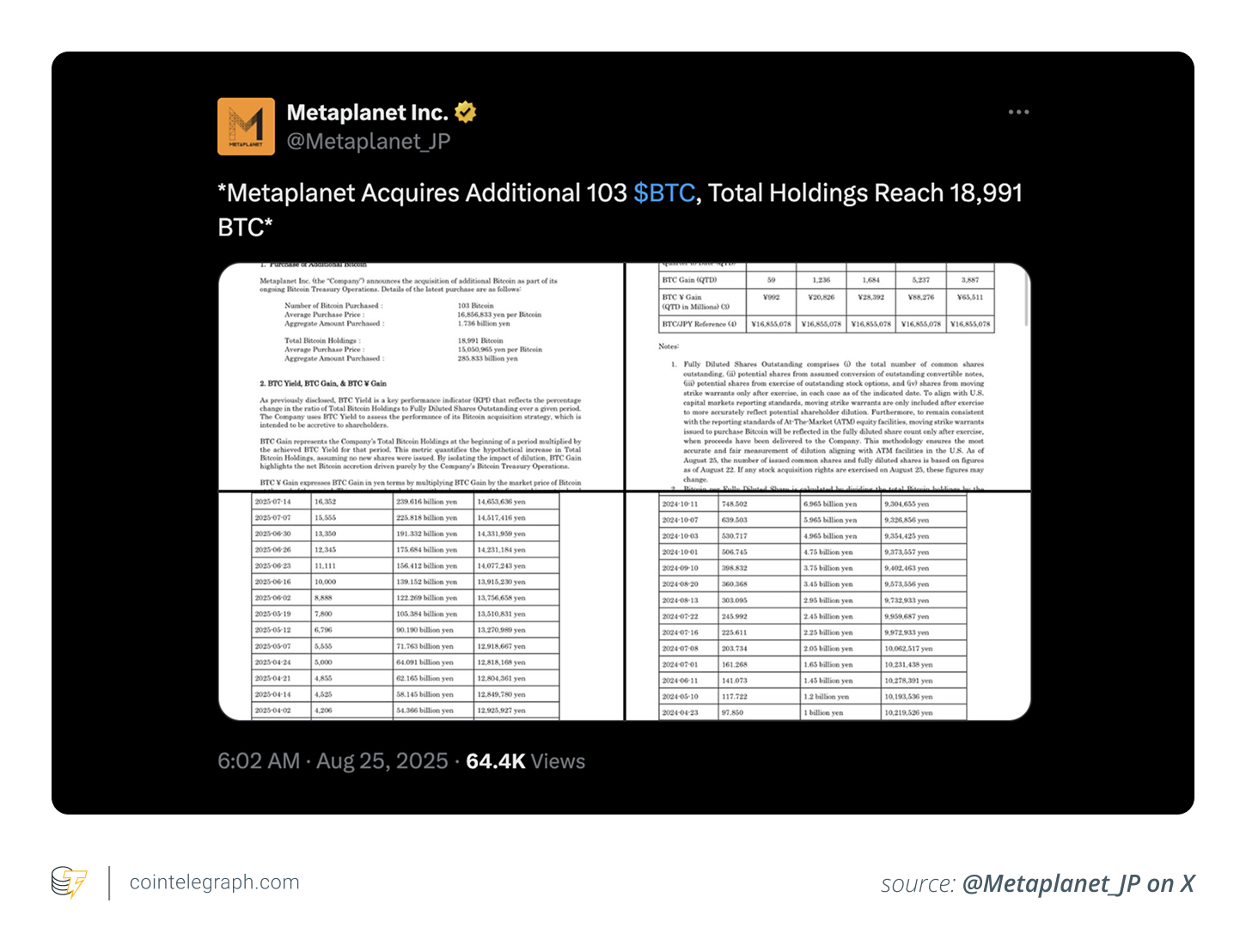 El optimismo en torno a estas reformas ya es visible. Metaplanet, el mayor tenedor corporativo de Bitcoin de Japón, fue añadido al Índice FTSE Japan, una señal de creciente aceptación general. El 25 de agosto de 2025, la compañía compró otros 103 BTC, elevando sus tenencias totales a 18.991 BTC.