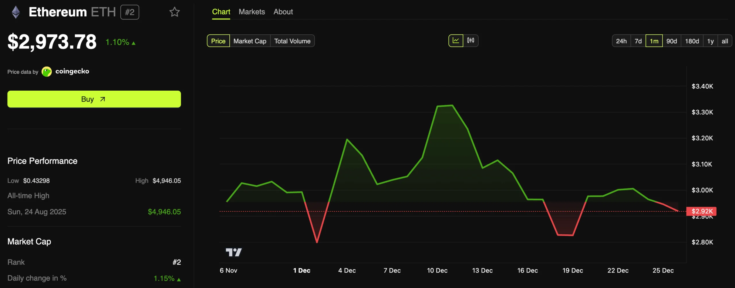 En el momento de escribir este artículo, Ethereum se encontraba negociando en 2,973.78 dólares, subiendo 1.10% en las últimas 24 horas, en línea con el mercado cripto en general.
