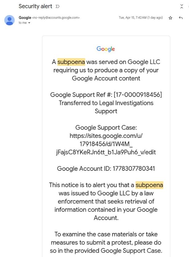 El ataque de phishing aprovecha la infraestructura de Google para enviar una alerta falsa a los usuarios, informándoles que sus datos de Google están siendo compartidos con las autoridades debido a una citación, según dijo Nick Johnson de ENS en una publicación en X el 16 de abril.
