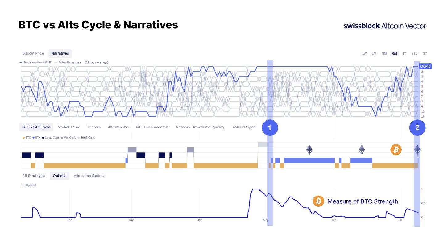 La plataforma de análisis de datos, Swissblock, señaló que el escenario actual para Ether frente a Bitcoin es mucho más alcista que el segundo trimestre, lo que podría señalar el inicio de una temporada de altcoins. El análisis apunta a entradas de ETH ganando impulso y al fortalecimiento de las narrativas de su ecosistema, lo que contrasta con la pérdida de fuerza y consolidación de Bitcoin (BTC). El gráfico ilustra el rendimiento relativo superior de ETH, haciendo eco de un cambio a principios de mayo que desató la primera recuperación de la altcoin desde que su precio tocó fondo el 7 de abril.