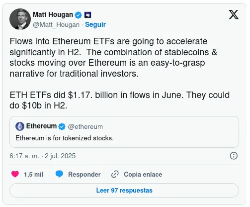 “Desde el 15 de mayo, los ETP spot de Ethereum han estado en auge, atrayendo más de 5 mil millones de dólares… Según nuestras estimaciones, los ETP y las tesorerías corporativas se han combinado para comprar 2,83 millones de ETH, más de 10 mil millones de dólares a los precios de hoy. Eso es 32 veces el nuevo suministro neto en el mismo período”, dijo Hougan en un hilo.