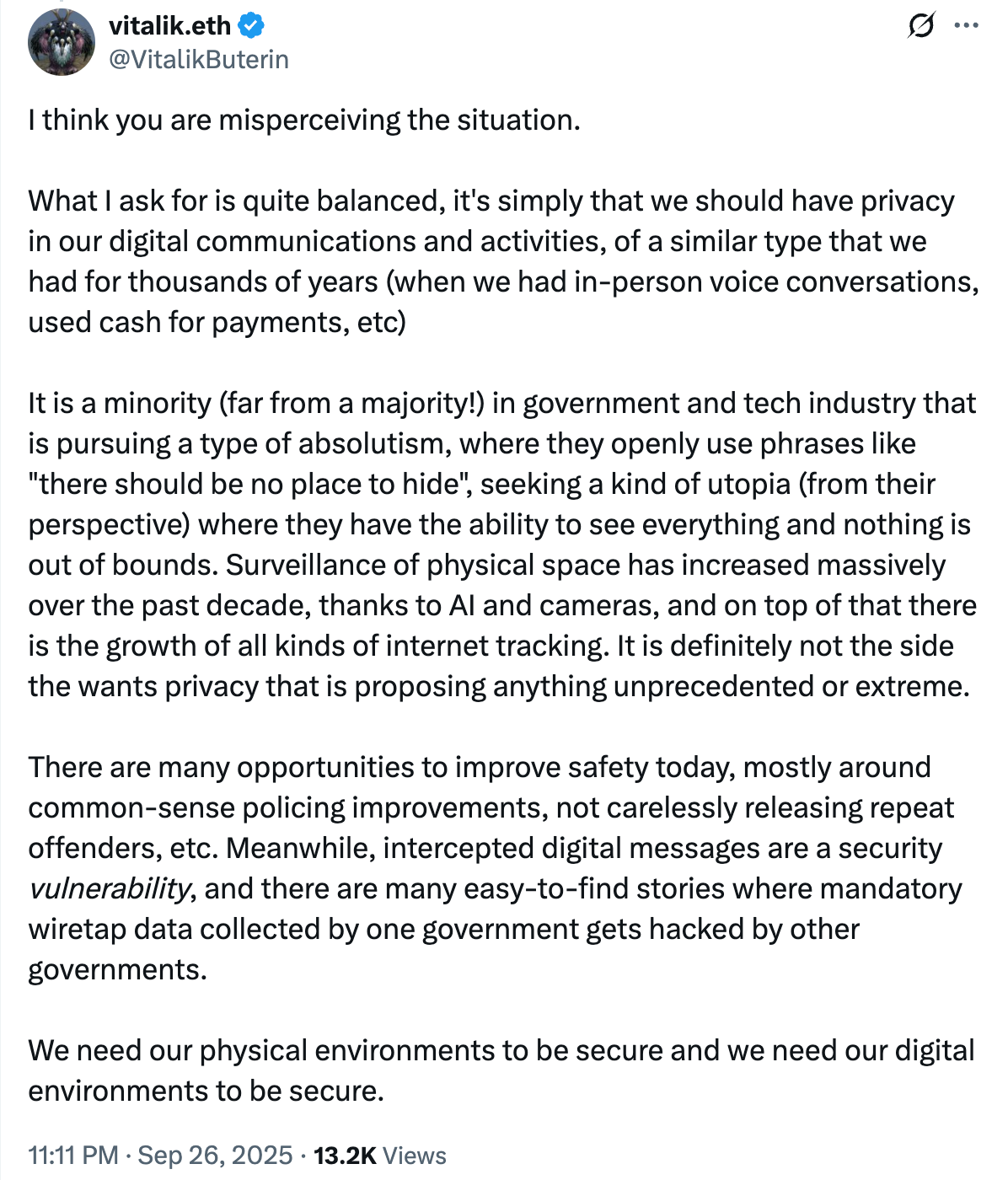 “No puedes hacer que la sociedad sea segura haciendo que la gente sea insegura. Todos merecemos privacidad y seguridad, sin puertas traseras inevitablemente hackeables, para nuestras comunicaciones privadas», dijo Buterin .