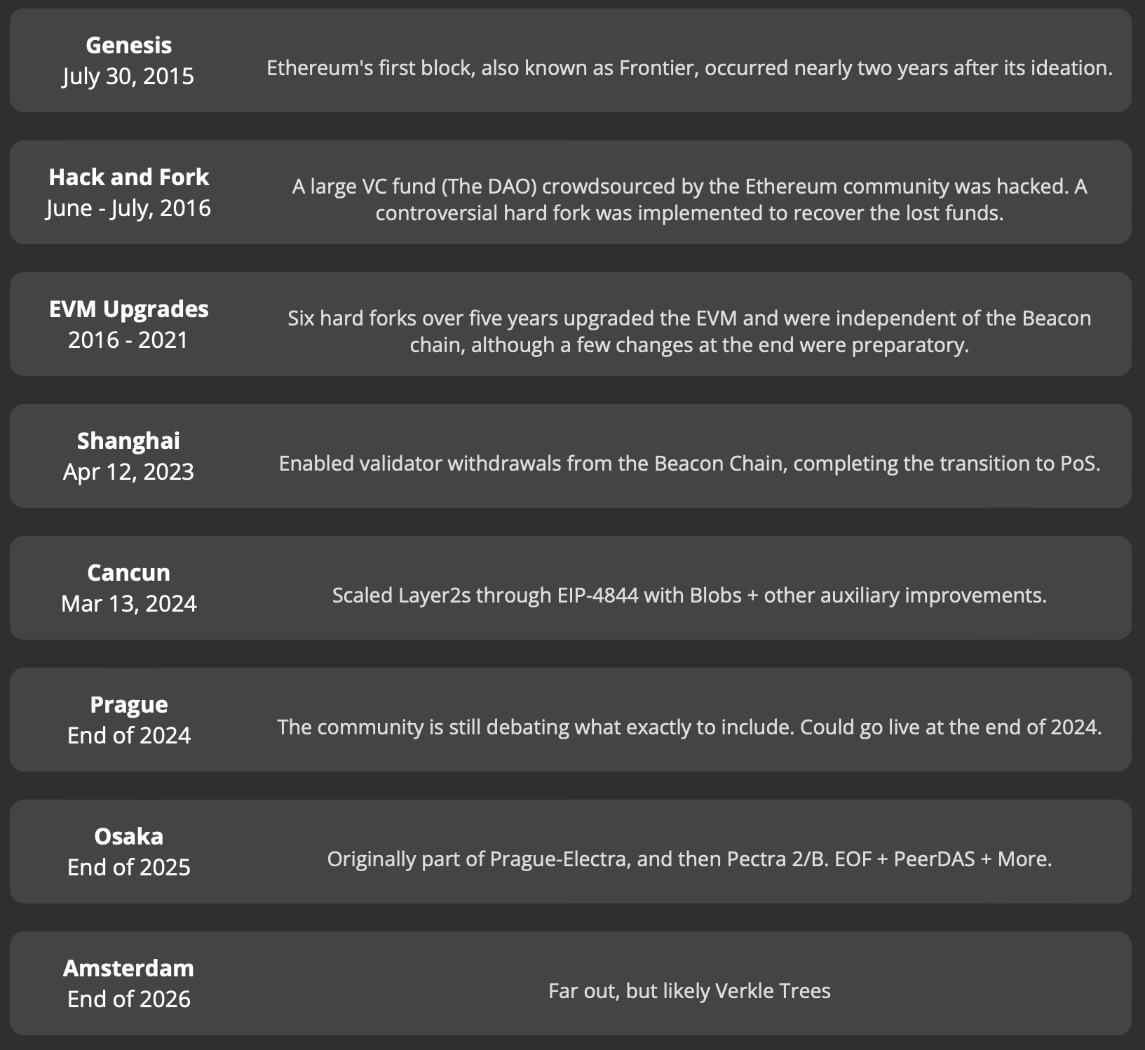Desde su lanzamiento en julio de 2015, la red Ethereum ha sido objeto de varias actualizaciones importantes para mejorar la escalabilidad, la seguridad y el rendimiento.