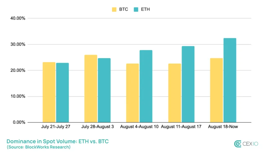 El mercado cripto registró un evento histórico: Ethereum supera a Bitcoin en volumen de spot trading dentro de los principales exchanges centralizados (CEX). Según datos de CEX.IO, ETH alcanzó el 32% de la actividad total en agosto, el mayor nivel desde 2017. Este cambio refleja una transición en la atención de los traders y abre un debate sobre las implicaciones de mercado a corto y mediano plazo.