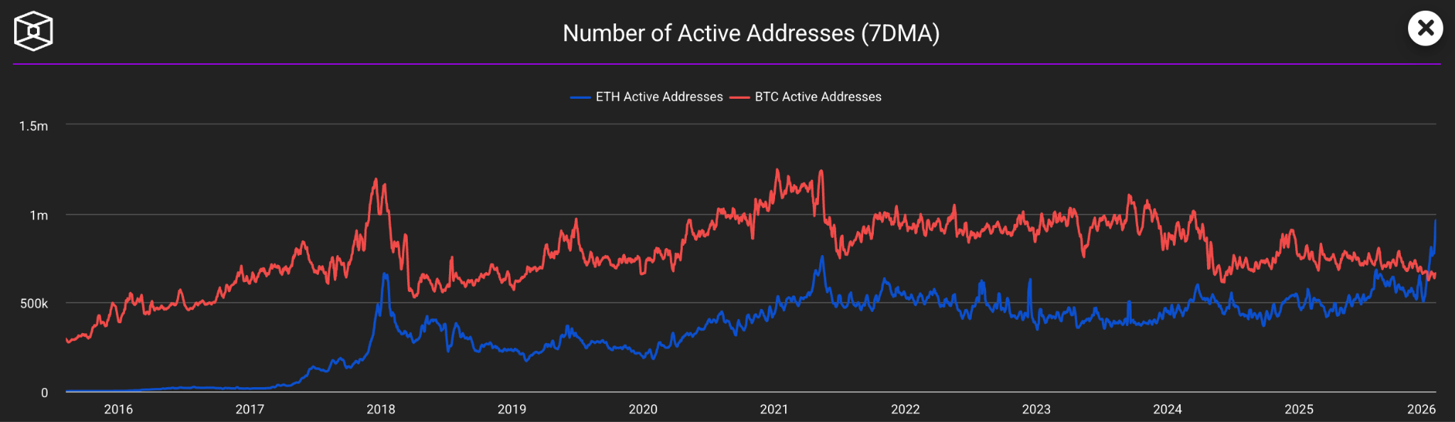 Por primera vez en la historia del mercado de criptomonedas, Ethereum superó a Bitcoin en el número de direcciones activas diarias. El movimiento, iniciado en diciembre de 2025 y consolidado en enero de 2026, muestra a Ethereum con un promedio de 950.000 direcciones activas frente a las 650.000 de Bitcoin, según datos de The Block.