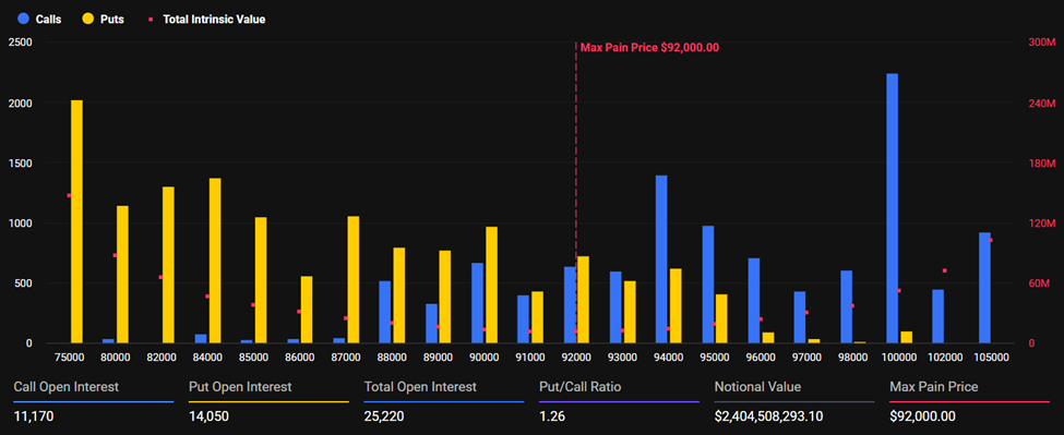 BTC se negocia en aproximadamente 95,000 dólares, claramente por encima de su nivel de máximo dolor, situado cerca de los 92,000 dólares. Esto incrementa la probabilidad de movimientos bruscos mientras los operadores ajustan o cierran posiciones.