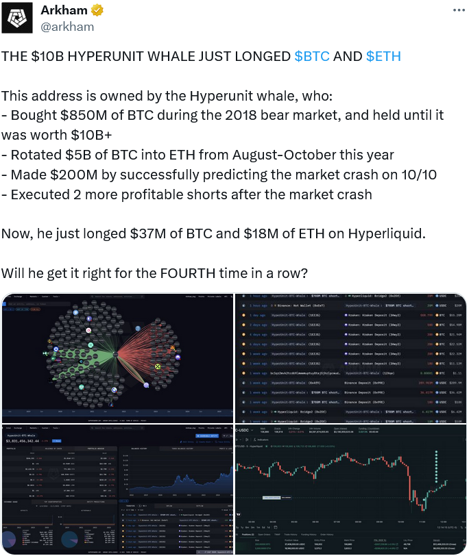 La plataforma de análisis de criptomonedas, Arkham, fue una de las primeras en identificar las nuevas posiciones largas de la ballena en una publicación en X el lunes, que comprende una posición larga de 37 millones de dólares en Bitcoin y una posición larga de 18 millones de dólares en Ether en el exchange descentralizado de derivados, Hyperliquid.