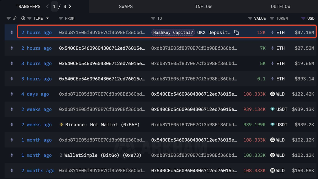 According to on-chain tracking platform Lookonchain, a wallet likely linked to HashKey Capital, a major crypto investment firm, transferred 12,000 ETH (worth approximately $47.18 million) to the OKX exchange just two hours ago.