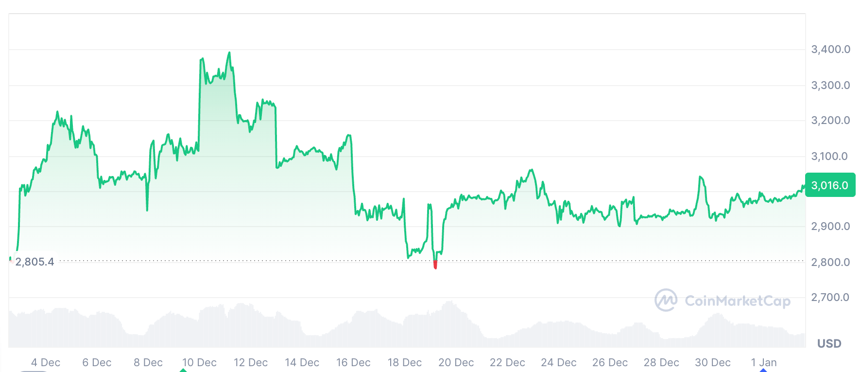 Ether (ETH) cerró el 31 de diciembre cotizando a unos 2.980 dólares, alrededor de un 13,7 % menos que al comienzo del año, según CoinMarketCap.