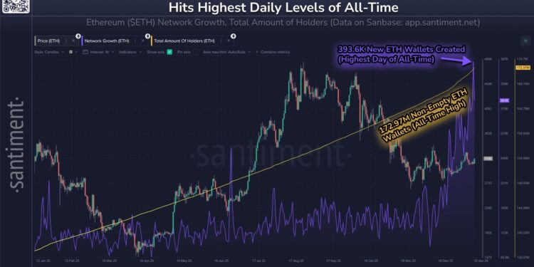 Durante la última semana, se crearon un promedio de 327.000 nuevas billeteras por día, y el domingo se registró el número más alto en un solo día con más de 393.000, según analistas de Santiment en una publicación de X el martes.