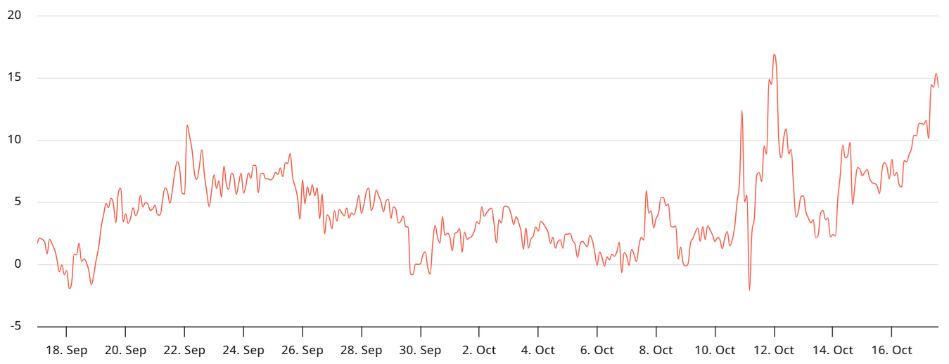 La prima mensual de los futuros de ETH en comparación con los mercados al contado se deslizó al 4%, por debajo del umbral neutral del 5%. El sentimiento de los traders ya había sido sacudido por la caída repentina del 10 de octubre, y la última fase alcista notable fue a principios de febrero. Los traders de Ether parecen cada vez más dudosos sobre la fuerza de cualquier impulso alcista duradero.