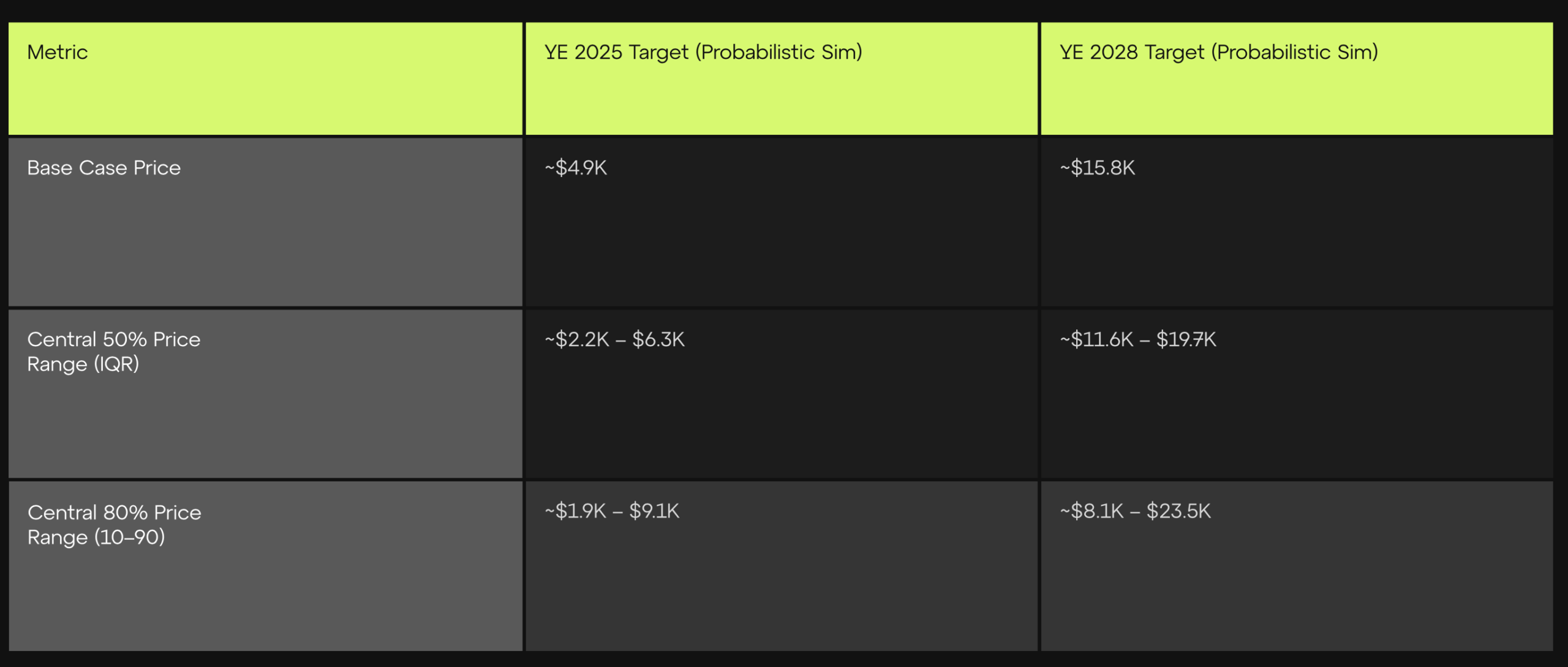 Utilizando un modelo de «costo de corrupción», Consensys prevé que el precio del ETH alcance los USD 4.900 a finales de 2025 y los USD 15.800 en 2028. Linehan dijo que el modelo asume un valor de 1 billón de dólares en monedas estables, USD 500.000 millones en activos del mundo real tokenizados (RWA) y USD 300.000 millones en valor total bloqueado (TVL) para 2028, cifras que considera conservadoras.