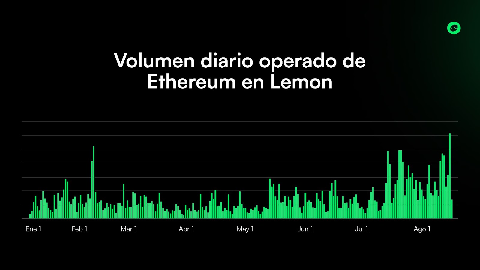 Según compartieron desde Lemon, julio de 2025 fue el mes con mayor volumen operado de ETH en la historia de la billetera digital, con un 57% destinado a compras. En lo que va de agosto, la tendencia continúa, logrando la semana anterior un nuevo récord histórico diario de volumen operado y superando los números de julio.
