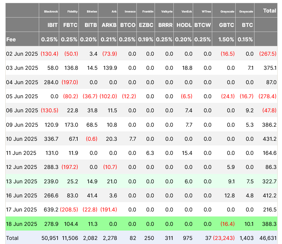Los fondos cotizados en bolsa (ETF) de Bitcoin con sede en EE.UU. registraron el miércoles entradas valoradas en 388,3 millones de dólares, lo que supone ocho días consecutivos de capital fresco, a pesar del pánico inicial del mercado por el conflicto entre Israel e Irán.