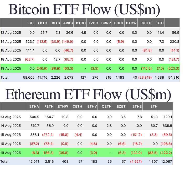 Flujos diarios de los ETF de Bitcoin y Ether desde el 13 de agosto. Fuente: Farside.co.uk