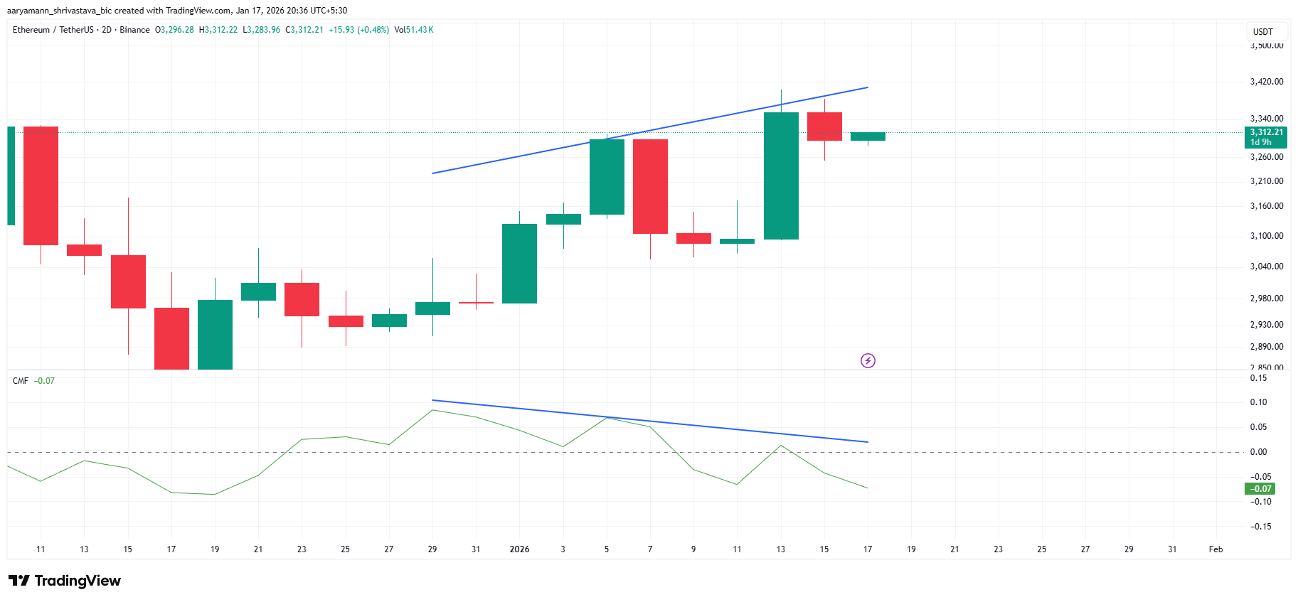 El precio de Ethereum se negocia cerca de 3,309 dólares al momento de escribir este artículo, justo por encima del soporte en 3,287 dólares.