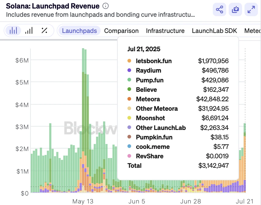 In the past 24 hours, LetsBONK.fun platform recorded a revenue of about $1.97 million while Pump.fun registered around $429 million.