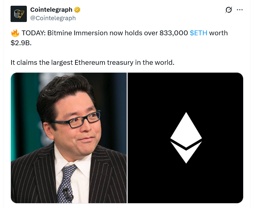 “BitMine se movió a la velocidad del rayo en su búsqueda de la ‘alquimia del 5%’ de ETH, aumentando nuestras tenencias de ETH a más de 833.000 desde cero hace 35 días”, dijo Lee, añadiendo: