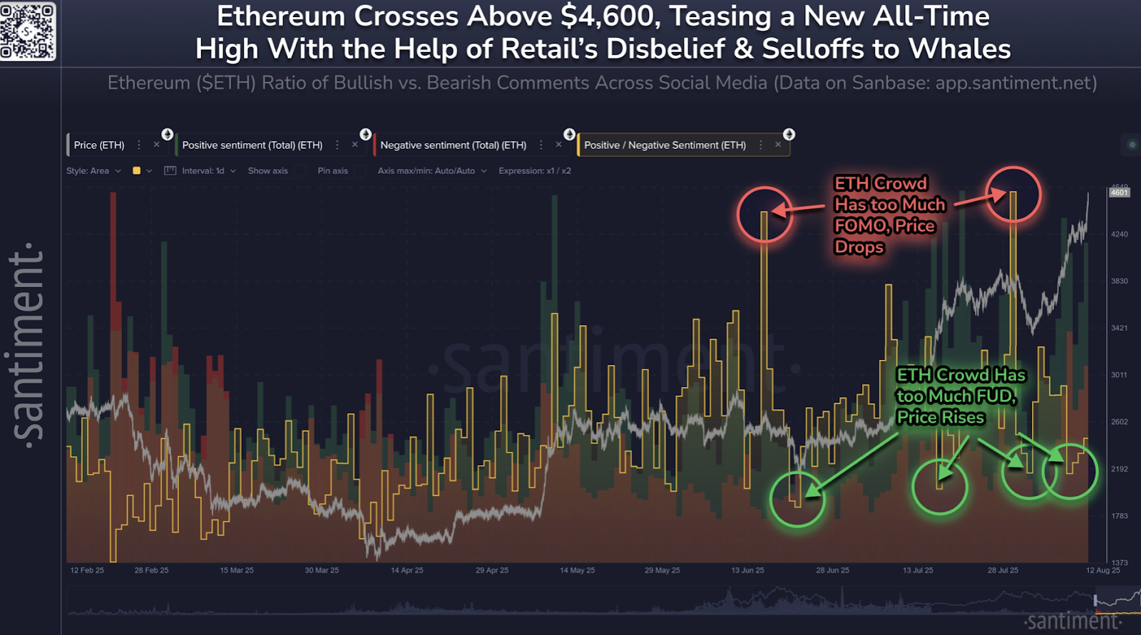 “Los traders han mostrado FUD [miedo, incertidumbre y duda] e incredulidad a medida que el activo alcanza precios cada vez más altos”, afirmó Santiment en una publicación de X el martes, mostrando que los comentarios bajistas en redes sociales sobre Ether (ETH) superan a las observaciones alcistas.