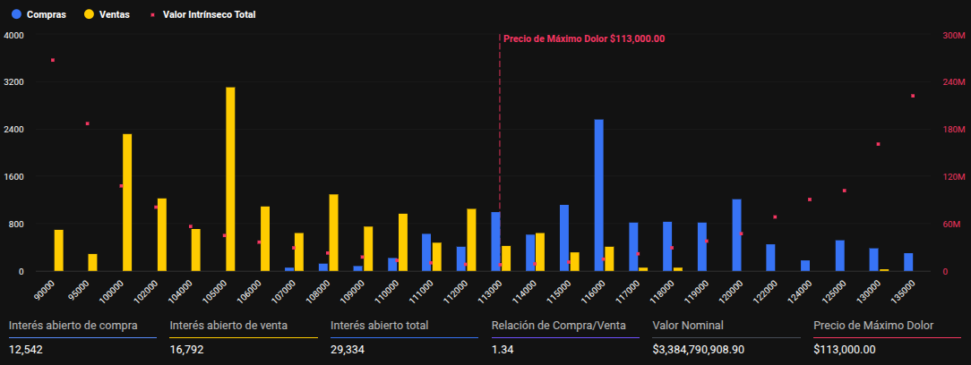 El vencimiento de opciones de Bitcoin representa aproximadamente 3,4 mil millones de dólares en valor nocional. El punto teoría de máximo dolor (max pain) se sitúa en 113,000 dólares, lo que indica el precio al que el mayor número de opciones podría expirar sin valor.