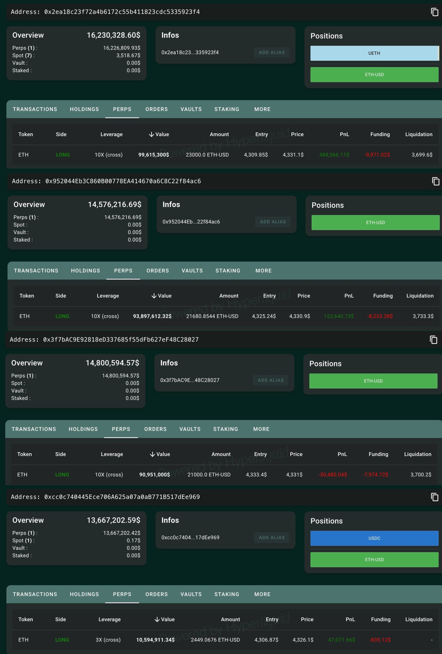 Tras la venta, la ballena abrió posiciones largas que totalizan 68,130 ETH (aproximadamente 295 millones de dólares) en cuatro monederos. La ballena utilizó apalancamiento de hasta 10x en la mayoría de las operaciones.