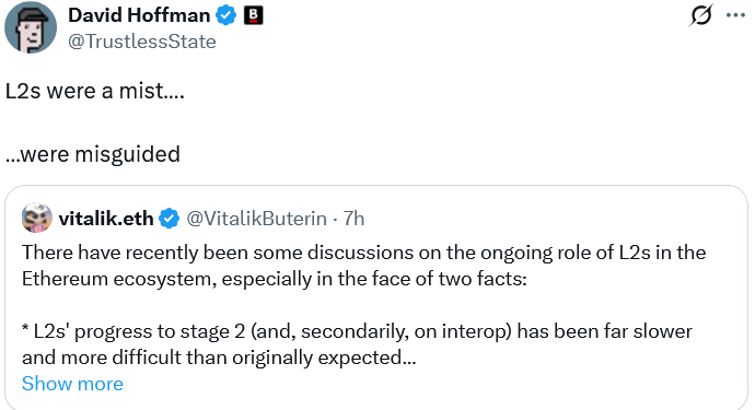 “Ambos hechos, por razones independientes, significan que la visión original de las L2 y su papel en Ethereum ya no tiene sentido, y necesitamos un nuevo camino.”