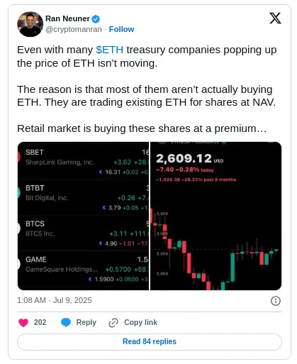 Neuner atribuye esta discrepancia a que las empresas están negociando Ethereum existente por acciones a valor neto de los activos (NAV) en lugar de comprar ETH nuevo.