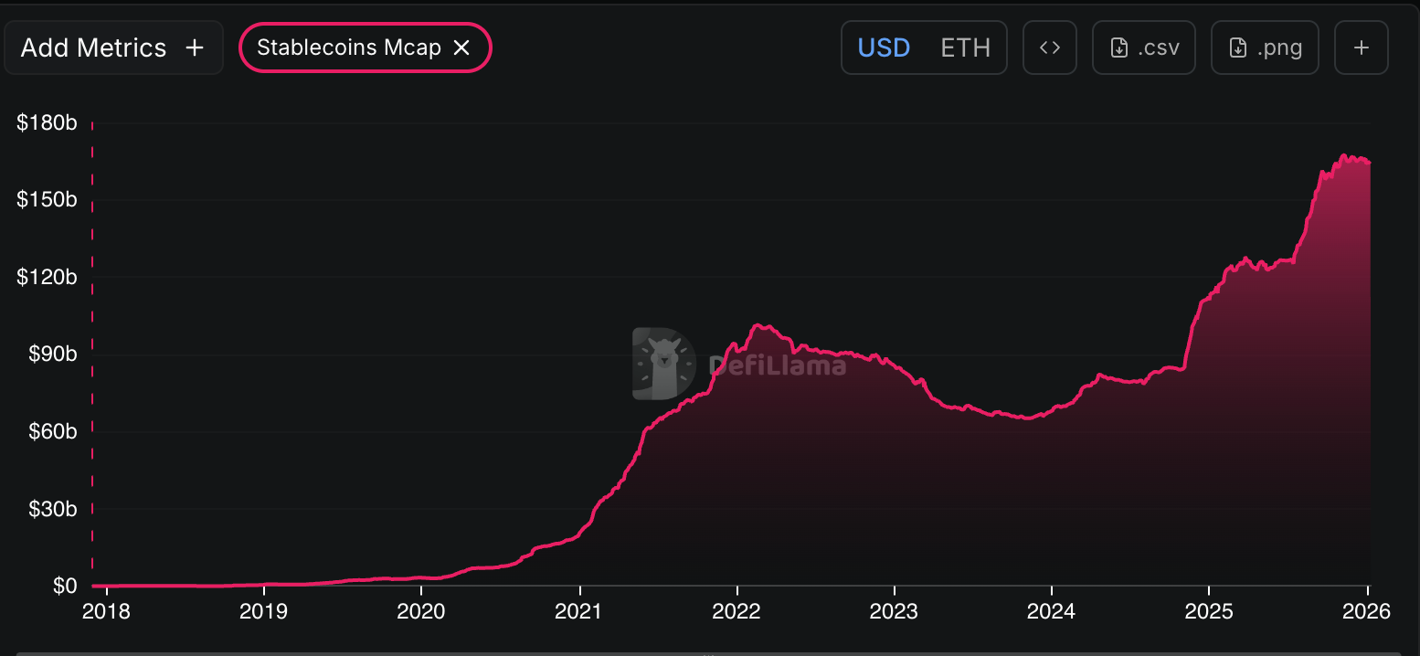 La capitalización de mercado total de stablecoins en Ethereum supera los 163.900 millones de dólares, con aproximadamente el 52% de la capitalización de mercado dominada por la stablecoin USDt (USDT, vinculada al dólar) del emisor de stablecoins Tether, según DeFiLlama.