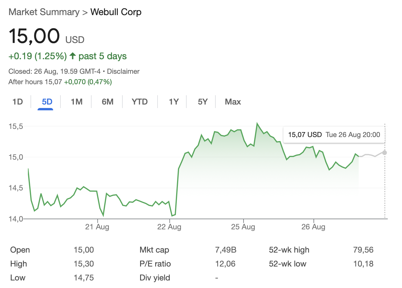 Las acciones de Webull (BULL) cerraron el lunes con una caída del 2,67 % y su cotización se mantuvo estable el martes, cerrando con una subida inferior al 0,3% a 15 dólares.