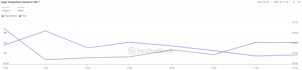 According to data from IntoTheBlock, the volume of large Ethereum transactions has dropped significantly. Whale activity has fallen from a peak of $9.81 billion to just $2.75 billion, showing a clear decline in interest from big investors. Recent activity supports this trend—on April 14, a whale moved 20,000 ETH (worth about $32.4 million) to the Kraken exchange, likely in preparation for selling.
